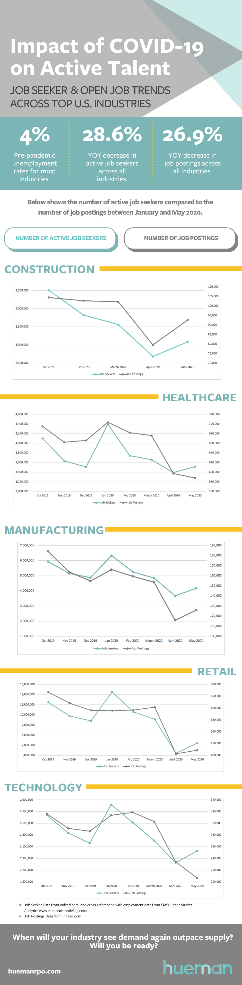 To begin to understand what is happening and as we look toward the future of talent acquisition, we pulled data on active job postings and jobseekers for five of the top industries in the U.S. (Healthcare, Technology, Construction, Retail, and Production/Manufacturing).
